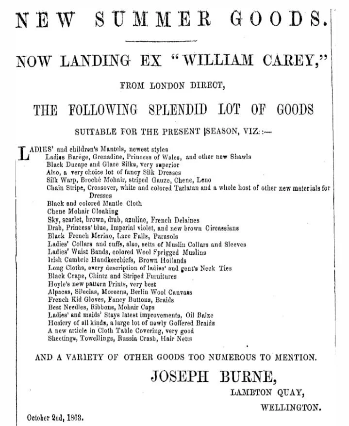 Ladies’ shawls, fancy silk dresses, collars, cuffs, waistbands, coloured wool sprigged muslins, Irish cambric handkerchiefs, French kid gloves, mohair caps, hosiery, cloth table coverings, hair nets.