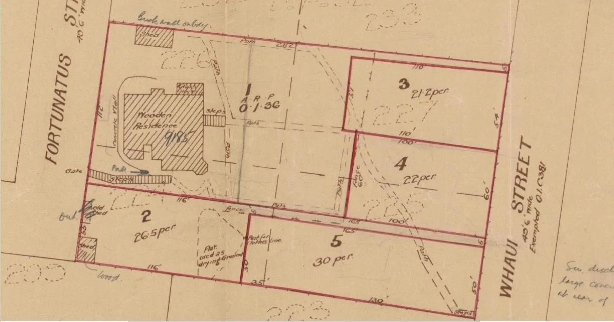 Patrick died in 1914 and Mary in 1930. Their property in Fortunatus Street was then subdivided into five sections, with the lower ones having direct access from Whaui Street. The house appears to have been substantially altered since the subdivision, and the glasshouse removed to make way for a sizeable extension. The house is still standing.