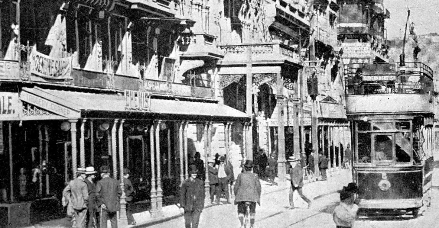 The canopy in the middle of the photo belonged to the King’s Chambers building. This building was designed by William Chatfield and completed in 1902. Chatfield also designed the Stewart Dawson’s Building opposite. King’s Chambers was demolished in the mid-1970s to make way for the new Bank of New Zealand building.