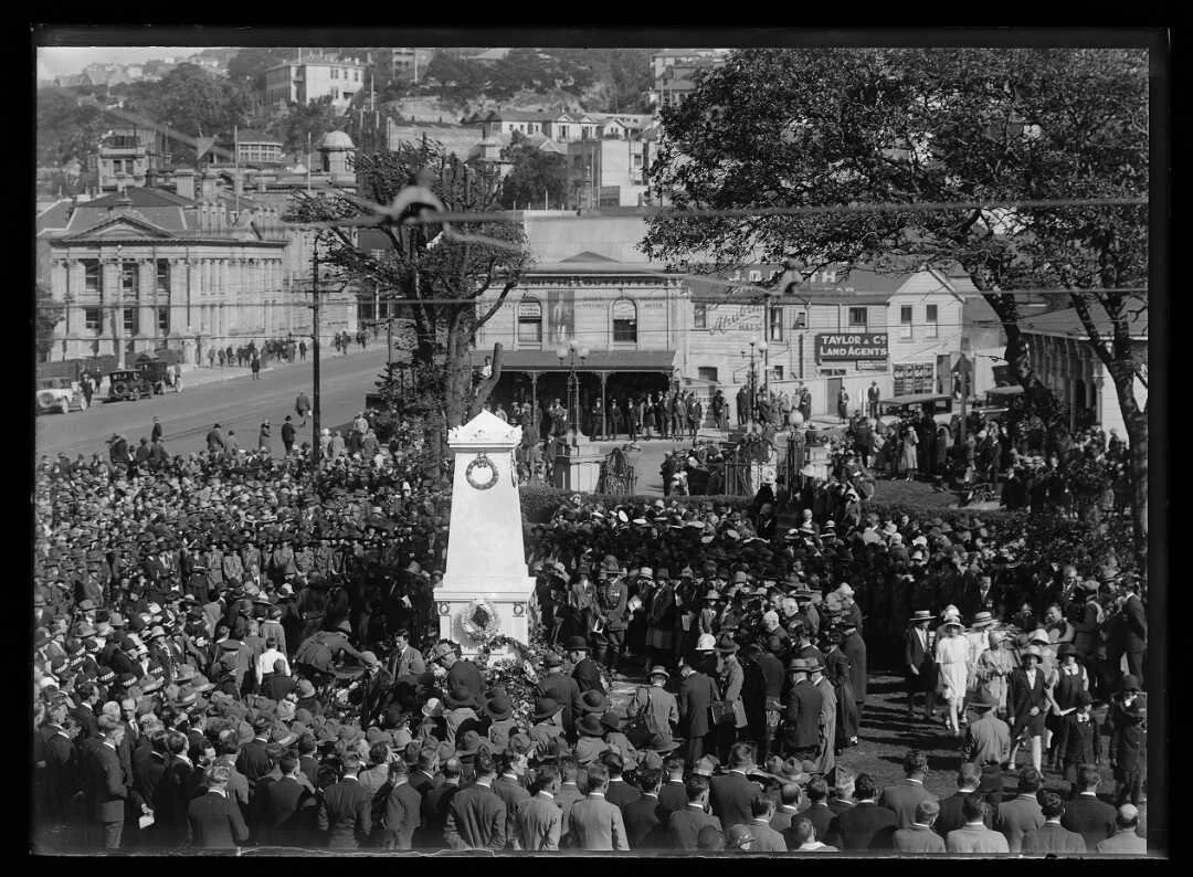 In 1920, the Wellington Returned Soldiers’ Association proposed to build a temporary cenotaph for Anzac Day opposite the parliamentary buildings. This monument would remain the focus for Anzac Day services for following nine years at various locations around the city, while a more substantial monument was discussed and planned.