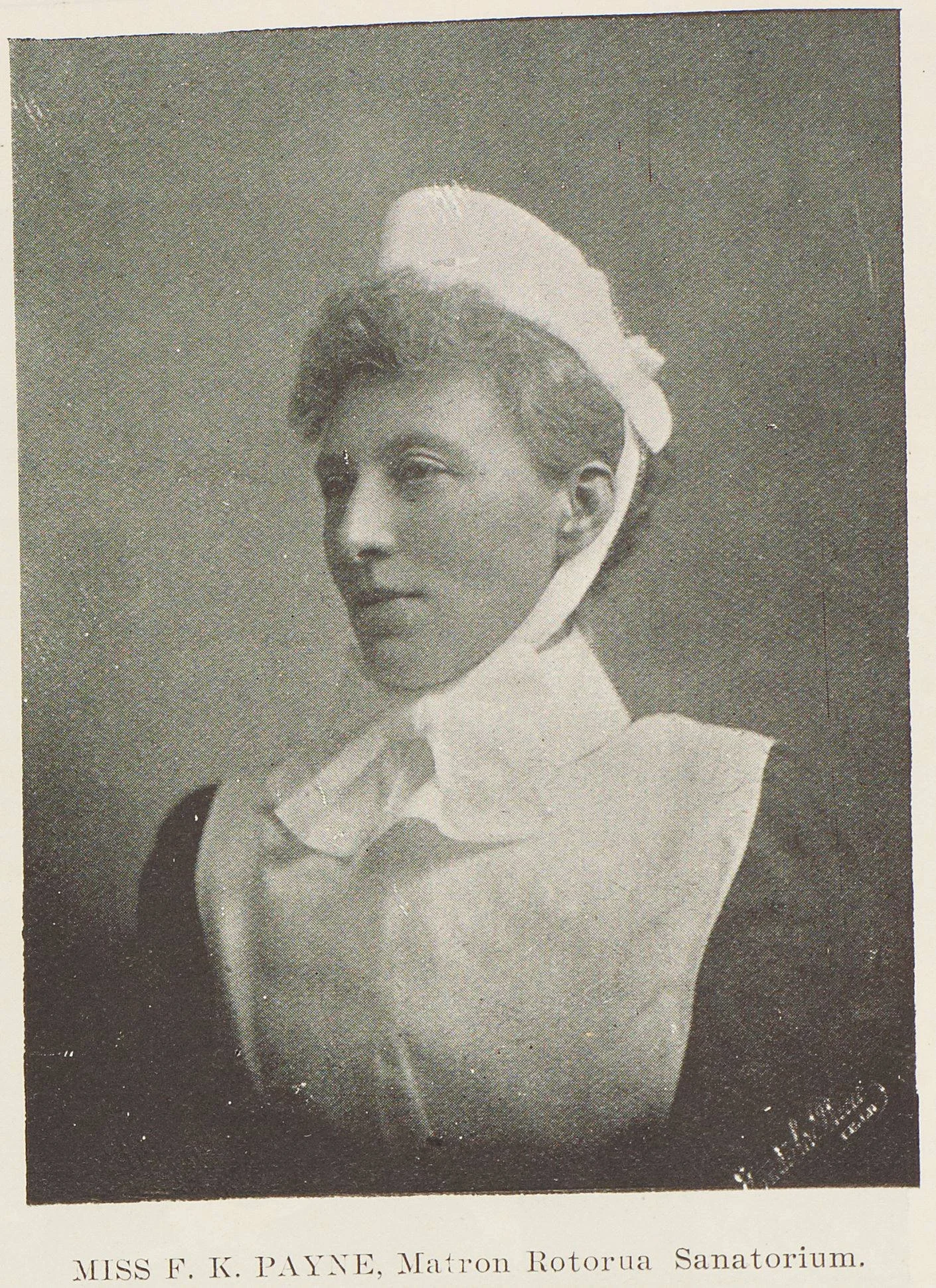 Frances Keith Payne began her nursing training in 1890 at Wellington hospital. She was promoted to matron in 1899 and remained in the role until 1902, when she left to take up the role as matron of the Rotorua Sanitorium.